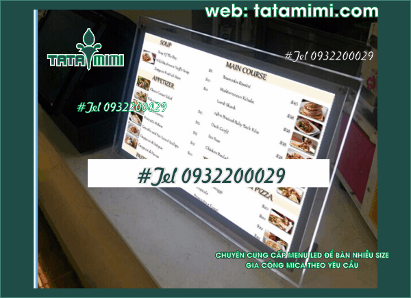 Những mẫu mã của chúng tôi có thể đáp ứng được theo nhu cầu của quý khách hàng. Biển menu thực đơn được làm từ chất liệu Mica, có khung, có đèn Led sáng rất sang trọng phù hợp với nhu cầu của quý khách hàng.