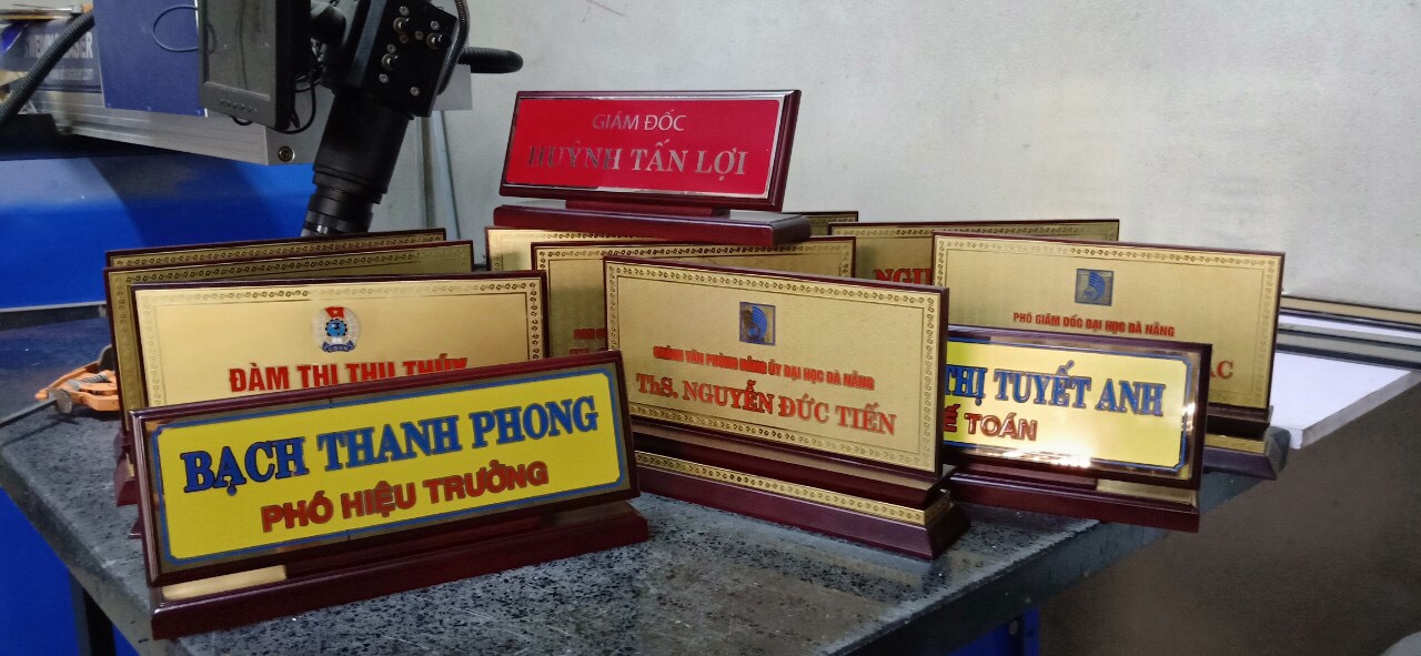 Biển chức danh bằng gỗ để bàn có ưu điểm khá gọn nhẹ,đẹp mắt,nội dung thông điệp truyền tải ngắn gọn nhưng vẫn đầy đủ để mọi người hiểu,nắm bắt thông tin nhanh chóng.Biển chức danh đế mặt gỗ,biển chắc danh đế gỗ viền đồng,biển chức danh theo yêu cầu để dễ dàng đặt ở không gian bàn của khách .