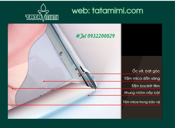 Cấu tạo biển quảng cáo hộp đèn siêu mỏng bắt tường thường được bắt ốc vít bằng inox cố định biển quảng cáo. Mặt biển thường dùng bằng Mica Đài Loan giúp dễ dàng thay thế dễ dàng và an toàn, không dễ vỡ.