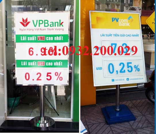 Mẫu biển lãi suất ngân hàng thường sử dụng nhôm aluminium, alu hoặc tôn. Chân làm bằng chột inox tròn, giá đỡ được làm bằng khung đỡ inox, có đế tròn được gia công có lực chịu được trọng lượng của cả bảng lãi suất.