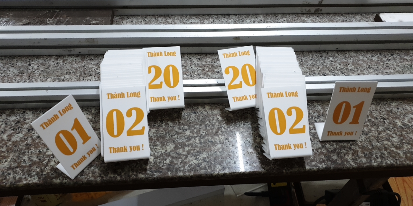 Biển số bàn Mica được thiết kế khá phù hợp với nhu cầu, biển số bàn được thiết kế theo nhiều kích thước. Chúng tôi có những mẫu có sẵn khá phù hợp, quý khách có thể đặt theo yêu cầu. Chất liệu được làm từ Mica, in tràn decal màu đỏ. Biển số bàn hiên nay được thiết kế đa dạng, phù hợp với nhu cầu sử dụng của khách hàng. Nếu quý khách đang cần làm biển số bàn theo yêu cầu, biển số bàn giá rẻ, biển số bàn đảm bảo chất lượng hãy liên hệ với chúng tôi- Đơn vị chuyên nhân làm biển số bàn đẹp theo mẫu mã và yêu cầu.