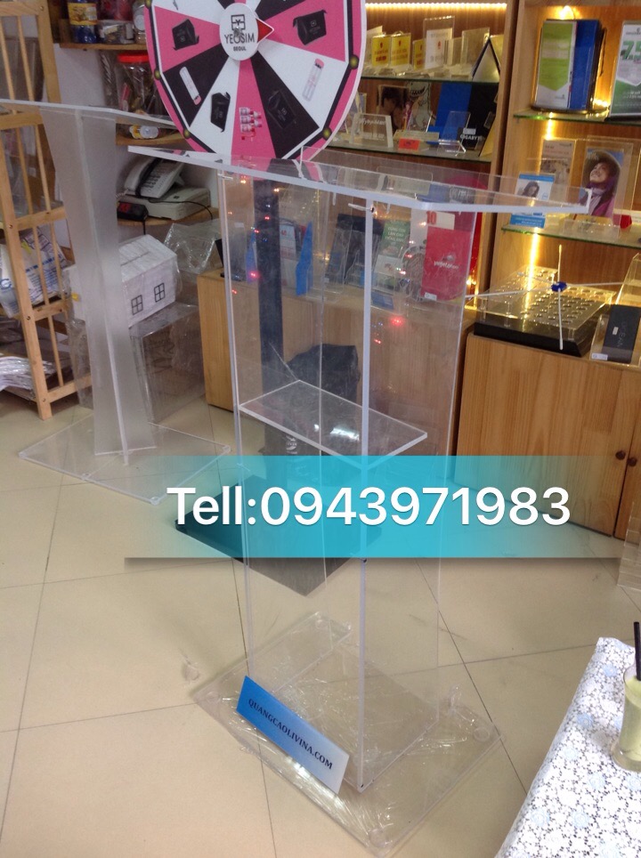 Bục phát biểu bằng mica chiều dầy 8mm, 10mm, có đủ kích thước và màu sắc theo yêu cầu khách hàng. Được chế tạo từ máy cắt laser, máy đánh bóng, dễ bảo quản, làm sạch nhanh bằng nước xà phòng, bền và ổn định lý hóa theo thời gian. Là sản phẩm gia công từ mica thời trang, thanh lịch, tinh tế, được sử dụng hoàn hảo và sang trọng trong nhà thờ, trường học, hội nghị, diễn đàn, khai trương, đại sứ quán, các cuộc họp báo.