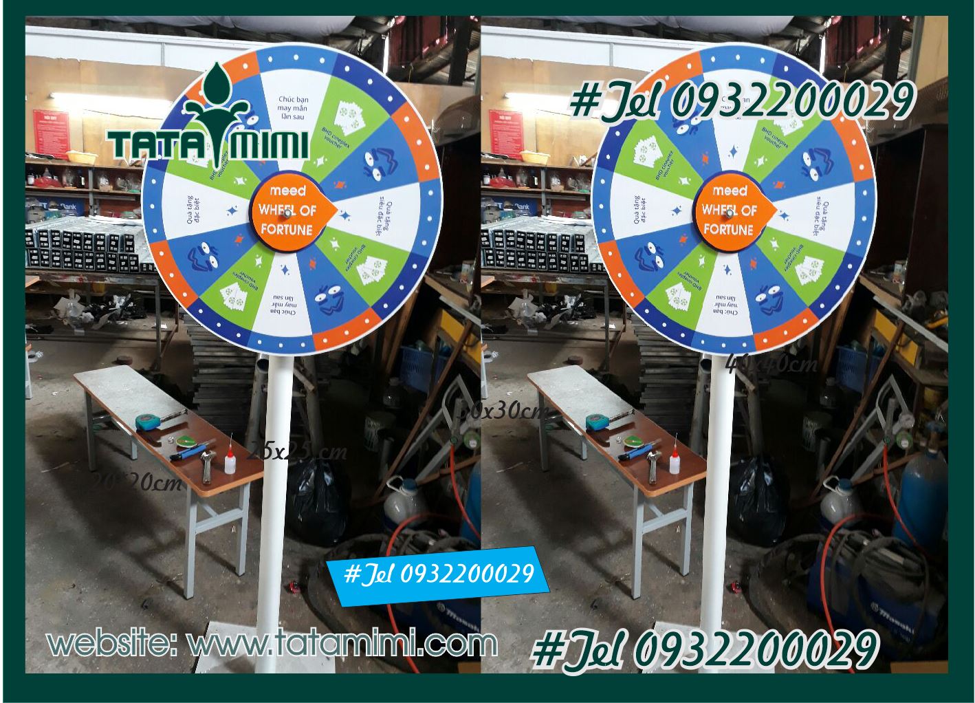 Chúng tôi có nhận đặt làm vòng quay trúng thưởng theo yêu cầu phù hợp với nhu cầu của quý khách. Các mẫu mã của chúng tôi luôn đẹp, đảm bảo chất lượng theo đúng tiêu chuẩn mà quý khách đưa ra.Vòng quay dạng đứng có chiều cao từ 1m60 đến 1m80 tùy vào mục đích sử dụng, vị trí và diện tích mà bạn có thể thiết kế cho mình một sản phẩm phù hợp nhất. Phần thân bằng sắt có chiều cao tùy thuộc vào quý khách hàng và được sơn màu theo yêu cầu. Phần mặt tròn có đường kích khoảng 25-30cm được làm bằng gỗ. Phần nội dung, in decall trực tiếp vào vòng quay trúng thưởng.