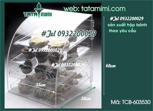 Hộp đựng bánh ngọt bằng mica được dùng để đặt tại bàn bán hàng, trên quầy bán hàng của các tiệm bánh, cửa hàng bán bánh, để trưng bày, bảo quản các mẫu bánh để khách hàng tiện tham khảo cũng như để bảo vệ sản phẩm khỏi các tác nhân gây bẩn sản phẩm. Sản phẩm có nhiều mẫu khác nhau có dạng một tầng có dạng nhiều tầng để có thể để được nhiều sản phẩm. Để sản phẩm phong phú đa dạng hơn chúng tôi có thể uốn theo yêu cầu của quý khách hoặc chúng tôi cũng có thể sản xuất theo thiết kế của quý khách.