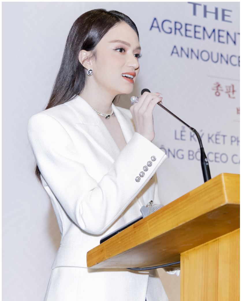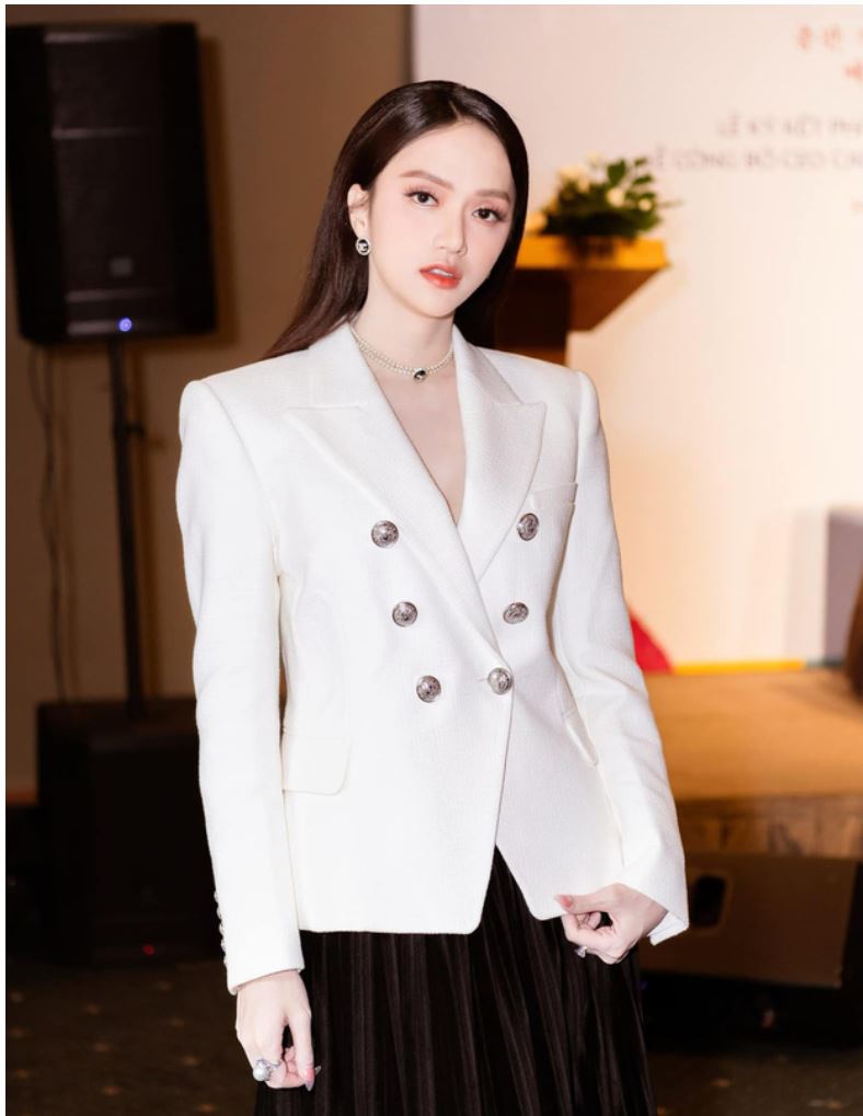 Hương Giang vốn là người đẹp đa tài của showbiz Việt. Cùng một lúc, cô điều hành công ty giải trí mang tên mình, kinh doanh bất động sản và đem tiền đi đầu tư nhiều chỗ. Mới đây nhất, nàng Hậu còn khiến dân tình choáng ngợp khi thông báo nhận chức CEO của một công ty khác. Tại sự kiện lên chức, Hương Giang ăn diện kín đáo nhưng không kém phần nổi bật, sang trọng.