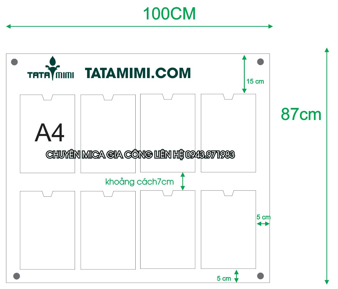 Gồm 8 hộp mica A4 đứng làm riêng từng cái và 1 tấm mica lưng có độ dày sử dụng 5mm hoặc là 8mm