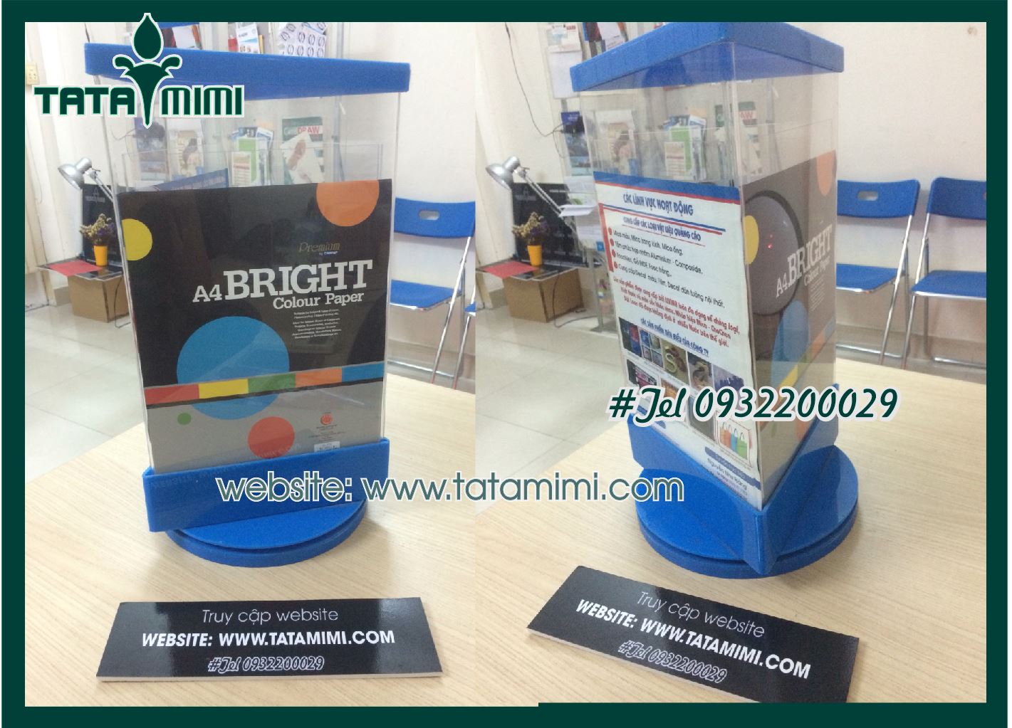 Chúng ta có thể thấy từ lâu kệ mica xoay 3 mặt để bàn đã được sử dụng khá rộng rãi trong cuộc sống đặc biệt là tại các văn phòng hay nhà hàng ,các buổi sự kiện , các cửa hàng siêu thị , các ngân hàng, bệnh viện, sân bay .Đôi khi khách hàng không chủ định tiếp cận những thông tin tờ rơi của bạn, nhưng với những chiếc kệ mica xoay 3 mặt để bàn thú vị, điều đó hoàn toàn co thể xảy ra.