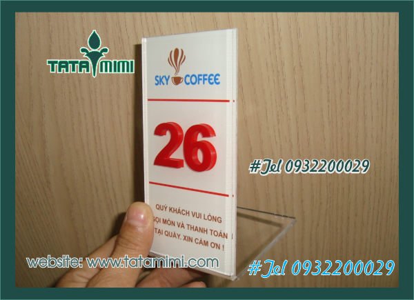 - Biển số bàn còn có tên gọi là thẻ tag để bàn, biển đánh số để bàn, biển đánh số thứ tự, biển gọi món, bảng đặt chỗ, biển đặt số thứ tự mica , biển số bàn gọi món