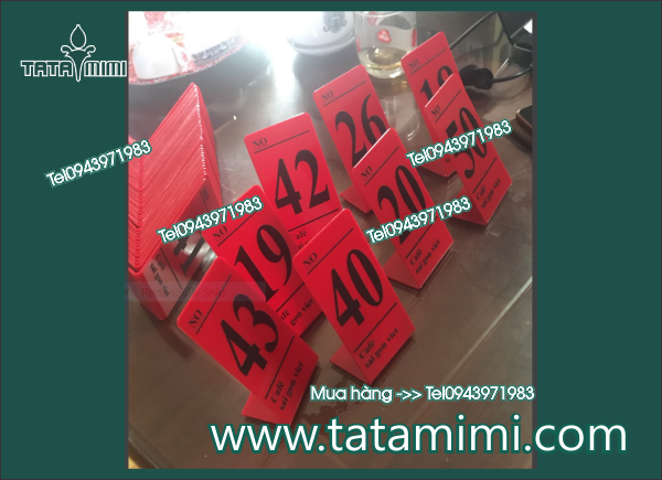 Mẫu biển số bàn mica đỏ nhà hàng tấn thủy có kích thước như sau