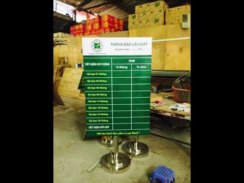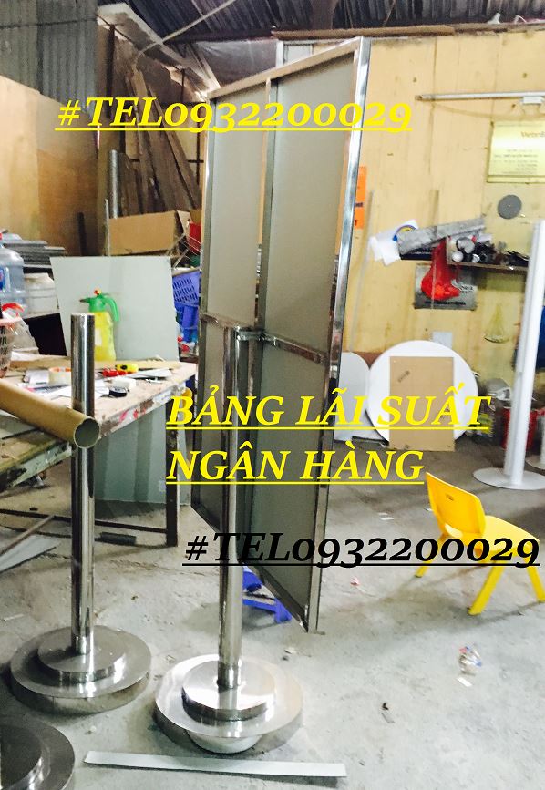 -Chân làm bằng cột inox tròn, giá đỡ của biển lãi suất ngân hàng được làm bằng khung đỡ inox, có đế tròn được gia công có lực chịu được trọng lượng của cả bảng lãi suất. Thông thường các ngân hàng thường lựa chọn bộ số di động, quý khách có thể hoàn toàn thay đổi nội dung dễ dàng trên các thanh ray.