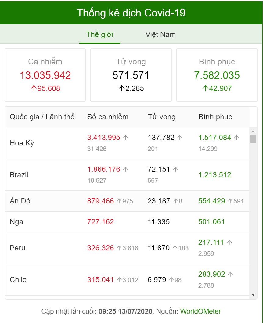 Tổ chức Y tế Thế giới (WHO) cho biết ngày 12/7 rằng, trong vòng 24 giờ, thế giới đã ghi nhận thêm gần 230.400 ca mắc Covid-19, nâng tổng số ca mắc Covid-19 toàn cầu lên khoảng 13 triệu ca. Đây là ngày có số người mắc Covid-19 tăng mạnh nhất kể từ khi đại dịch bùng phát cuối năm ngoái, trong khi đó, số người tử vong duy trì ở mức khoảng 5.000 ca/ngày. Đến nay đại dịch này đã lấy đi sinh mạng của hơn 570.000 người trên thế giới, số liệu của Worldometers cho biết.