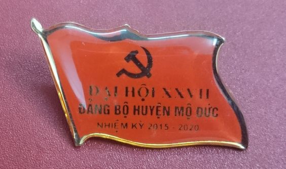 • Huy hiệu lá cờ được làm bằng đồng ăn mòn hoặc phôi đồng có sẵn, trên mặt in nội dung và logo. Bể mặt huy hiệu lá cờ đeo ngực được phủ một lớp keo trong suốt.