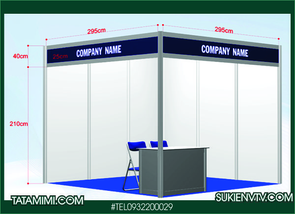- có kích thước 1×0,5×0,75m – 02 chiếc ghế xếp – 01 hoặc 02 bóng đèn huỳnh quang – 01 ổ cắm điện Phần bên trên là 3 thanh ngang có kích thước 0,4x3m dán bảng tên công ty.