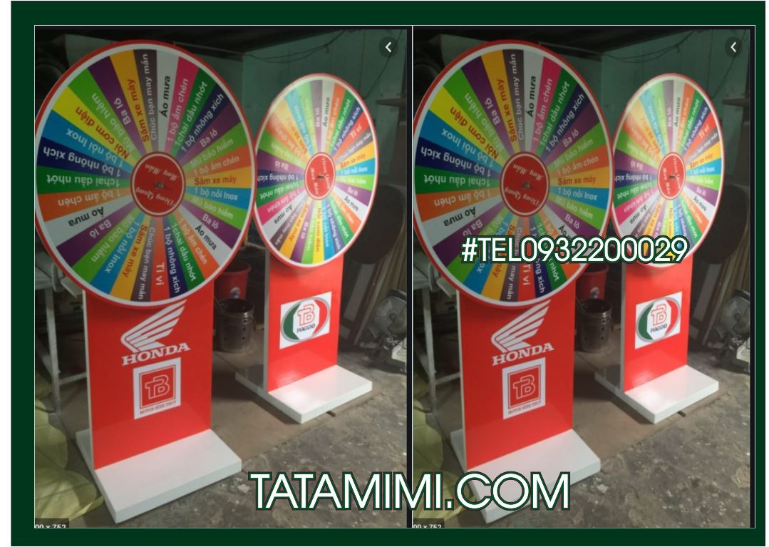 - Nội dung in trên mặt vòng quay và thân vòng quay honda là indecal tràn lên 1 mặt , hoặc có thể phun sơn ở thân 1 màu , hoặc để nguyên màu gỗ, nội dung trên mặt vòng quay thì in decal
